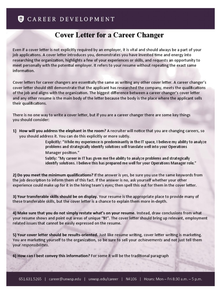 Open this text version, and then copy and paste it into your word processor. This cover letter example is specifically designed for career change positions in 2021. Mar 05, 2019 · a cover letter (covering letter) is a document attached to your job application that introduces you in a more personal way and compliments the info on your resume or cv, expanding on the skills and achievements, and highlighting a selection of your greatest career successes. An employer or hiring manager may wonder why you are changing careers and if you have the skills for your new career. Below is a career change cover letter template that can help you determine what type of information you should present in your own letter.